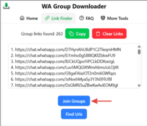 Click “Find URLs” to automatically detect all WhatsApp group links on the page.